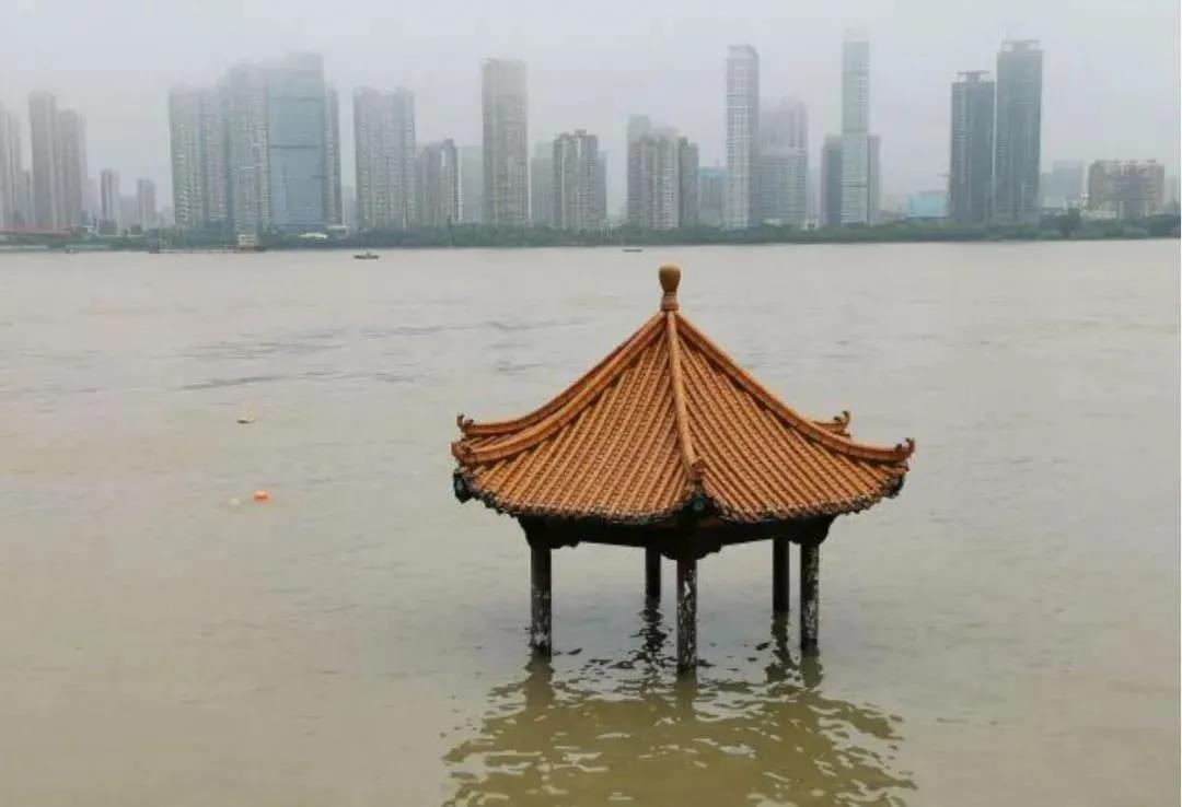 #圖為7月4日武漢武昌江邊黃花嘰親水涼亭,長江洪水已漫上親水平臺,長江武漢段水位超設(shè)防1米,涼亭孤鶩的矗立在滾滾洪流中#