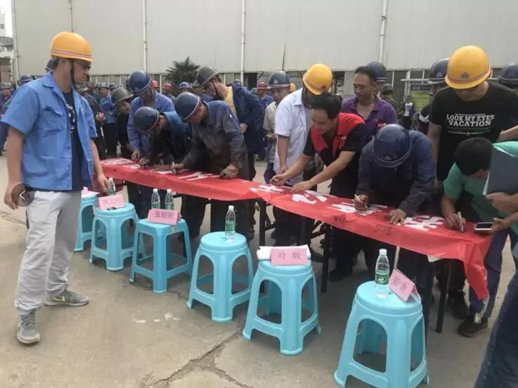 接著由敖志碩給全體員工講解了滅火要點,為了將所學知識付諸實踐,“趁熱打鐵”在員工中普及滅火器的使用方法,講解結束后,在廠區四跨前面舉行了滅火器滅火演練比賽,由公司領導打分,最終技術部獲得第一名,下料機加車間獲得第二名,總經辦第三名。在滅火器滅火實戰演練比賽后,進行了“我要安全,從我做起”的宣誓簽字活動,全體員工進行簽字活動